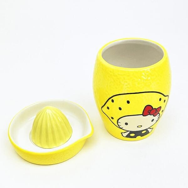 キティがそのままレモンを被ってキュートすぎる~。レモンキティということでこちらのアイテムでは、絞り器になるフタ付いているちょっと珍しいタンブラーとなっております。可愛いキティちゃんと一緒にレモネードなども楽しみたいところです、、、!【容量:380ml】【サイズ】本体:10cm×8.9cm×8.9cm、フタ:5.2cm×9.4cm×9.4cm 素材:磁器
