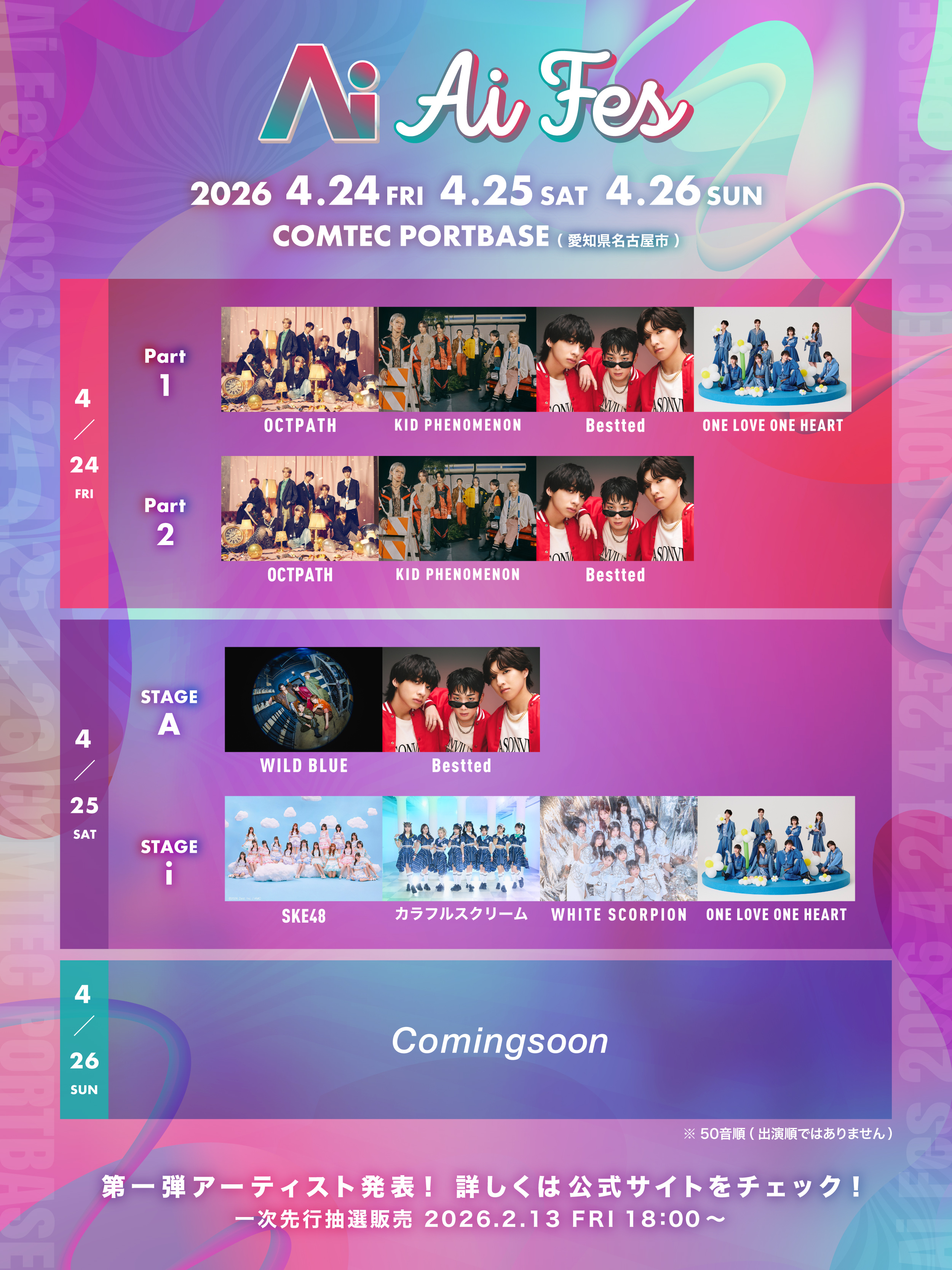 Ai FES実行委員会は、2026年4月24日(金)・25日(土)・26日(日)の3日間、COMTEC PORTBASEにて音楽イベント「Ai FES」を開催いたします。