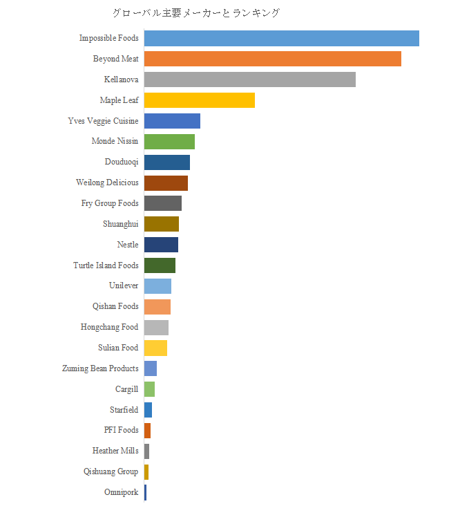LP Informationのトップ企業研究センターによれば、Impossible Foods、Beyond Meat、Kellanova、Maple Leaf、Yves Veggie Cuisine、Monde Nissin、Weilong Delicious、Douduoqi、Fry Group Foods、Shuanghuiなどが世界的な主要製造業者として挙げられる。2024年時点で、売上ベースにおける世界トップ10企業の市場シェアは約70.0%に達しており、ブランド力と研究開発投資を背景とした寡占構造が形成されている。多国籍食品企業と地域密着型メーカーが併存し、製品ポートフォリオと流通戦略の巧拙が競争力を左右している。