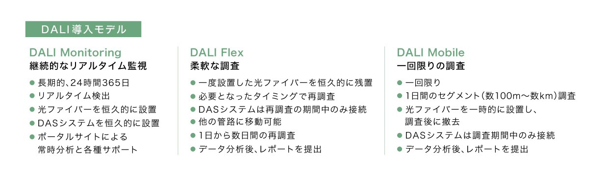 DALIは、重要管路・大口径管路向けの光ファイバー漏水検知システムで、分散型音響センシング技術によって管路の漏水を正確に検知することを可能にしました。高度な管路の維持管理を実現し、無収水量の削減と、資産の耐用年数を延ばすことができます。