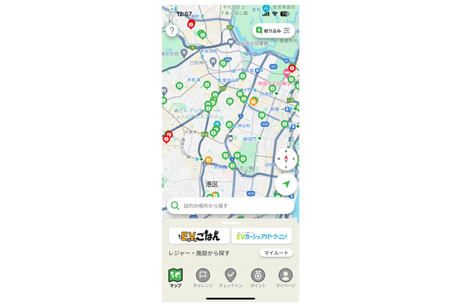 EV利用者が安心して楽しく出かけられるアプリサービスとして、最新のEV充電スポット情報 約37,500台(2024年5月時点)はもちろん、全国のおでかけ先の施設情報 約6,800件(2024年5月時点)を独自保有し、MAP上に表示、ルート案内も可能。
