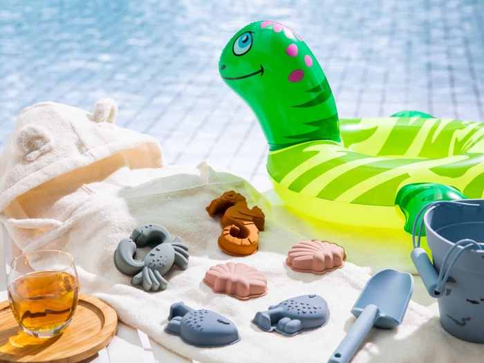 プールデビューサポートブック、水遊びセット(バケツ・スコップ・生き物の形の入れ物)、浮き輪、バスポンチョ(以上は全てレンタル)、麦茶