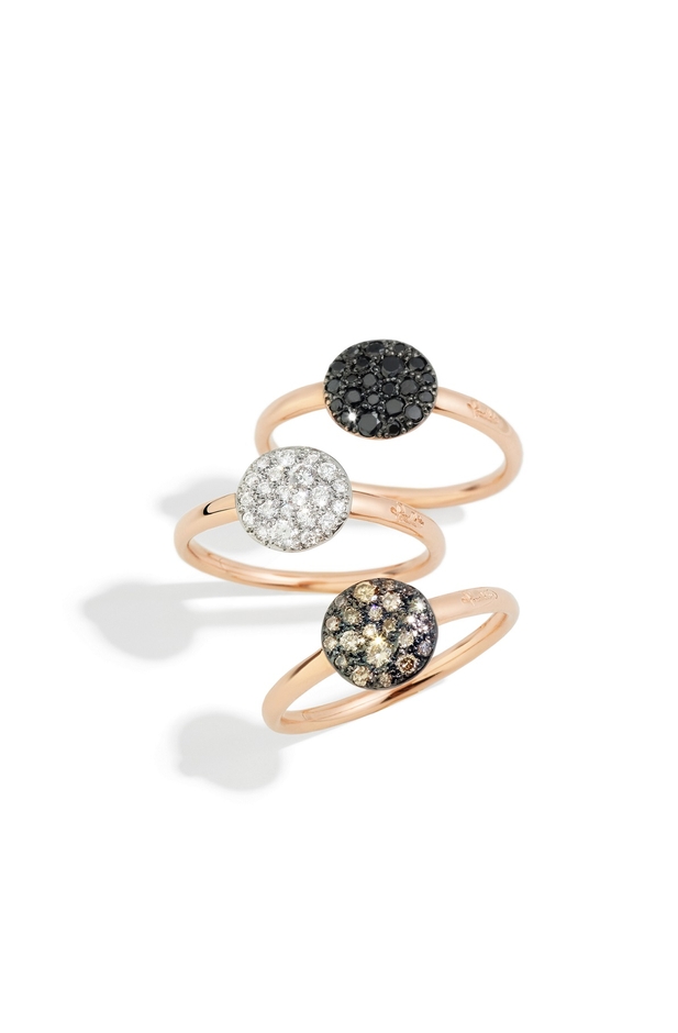 ブルニート仕上げまたはロジウム仕上げのローズゴールドにブラックダイヤモンド・ホワイトダイヤモンド・ブラウンダイヤモンドを組み合わせたプチリング:141,000円・208,000円・165,000円(本体価格)