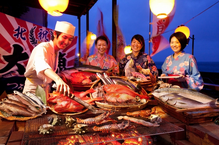 【とれとれ市場】テラスにて焼き立ての炭火焼をお好きなだけ