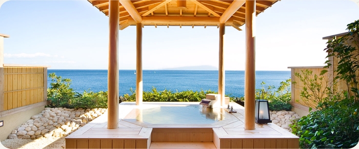 膳処「彩」では、テラス席もご用意しております。晴れた日には伊豆大島をゆったりと眺めながら、極上の朝ごはんをお楽しみください。海と空の青さをダイレクトに感じる、ここでしか体感できない非日常のひと時をお過ごしください。