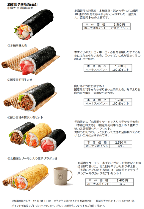 2021年度の予約販売商品は、近畿圏では本ずわいがに・帆立・まぐろ・サーモン・いか・数の子などを使用した具だくさんの「本ずわいがにと北海道産帆立入ご馳走太巻」など11種類、首都圏では北海道産大粒帆立・本まぐろ・活〆穴子など10種類の具材が入った直径約9㎝の「極太 幸福海鮮太巻」など5種類を販売いたします。