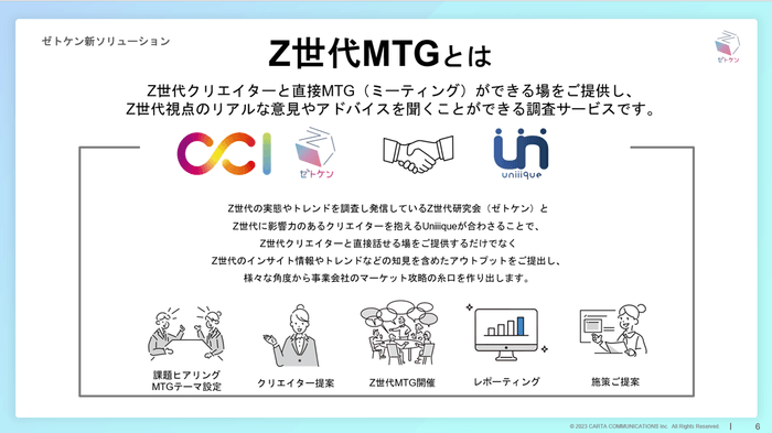 「Z世代MTG」とは、CCIのZ世代研究会(ゼトケン)とUniiiqueがZ世代クリエイターと直接ミーティングができる場を用意し、Z世代視点のリアルな意見やアドバイスを聞くことができる調査サービスです。
