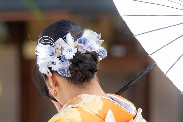 髪飾りのレンタルもプランに含まれていますのでご自身で用意いていただく必要はございません。ご自身でお持ちの場合は当日お持ち込みいただきましたらヘアスタッフよりお付けいたします。