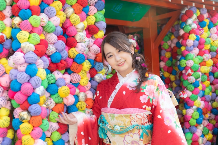 カラフルでインスタ映えすると話題です。八坂庚申堂がインスタ映えする理由は、着物とカラフルで布製の「くくり猿」と呼ばれるお守りとの色の相性が良いということ。