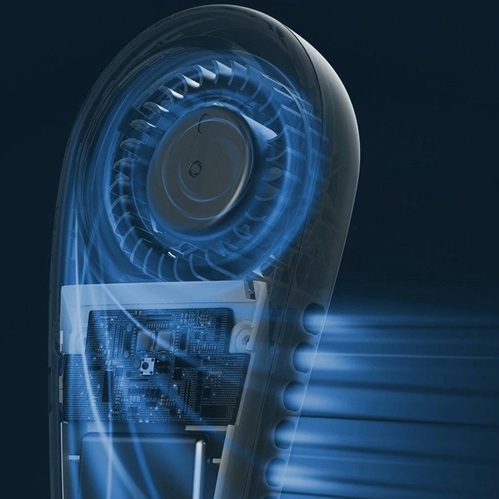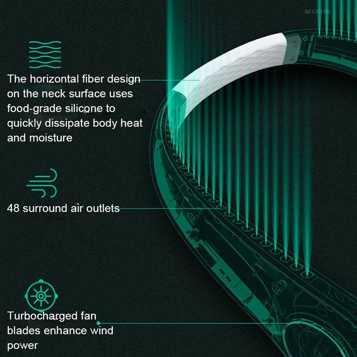 iCooLは従来のプロペラ型の首掛け扇風機とは異なり、羽根の無いターボエアーフローファンを採用し、ネックバンドには48個ものサラウンドエアアウトレットがあり、そこから首筋に冷たい風を直接運んでくれます。