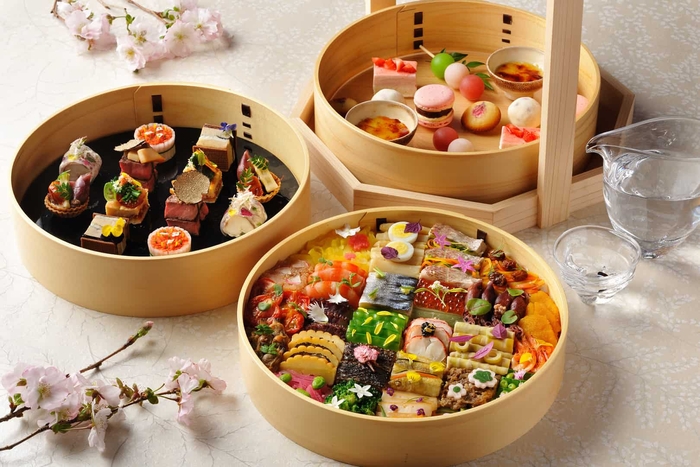 江戸時代の人々は、花見に出かける際にお弁当や酒器を持ち、旬の味覚とお酒とともに、咲き誇る桜を楽しんでいたと言われています(*1)。本アクティビティでは、桜鯛や桜海老、独活といった春の旬の食材を使用した特製花見弁当を用意します。星のや東京総料理長 浜田統之(はまだのりゆき)が手掛ける「Nipponキュイジーヌ ~発酵~」の要素を取り入れ、味はもちろん、目でも楽しめる華やかな花見弁当です。江戸時代に普及した発酵食品である赤酢を使用したちらし寿司や、純米酒・梅干し・かつお節で作った煎り酒で茹でた桜鯛の前菜などを詰め合わせています。甘味には、甘酒を練りこんだ桜餅のマカロンや、三色団子をモチーフにしたパート・ド・フリュイなどを季節のフルーツとともに提供します。