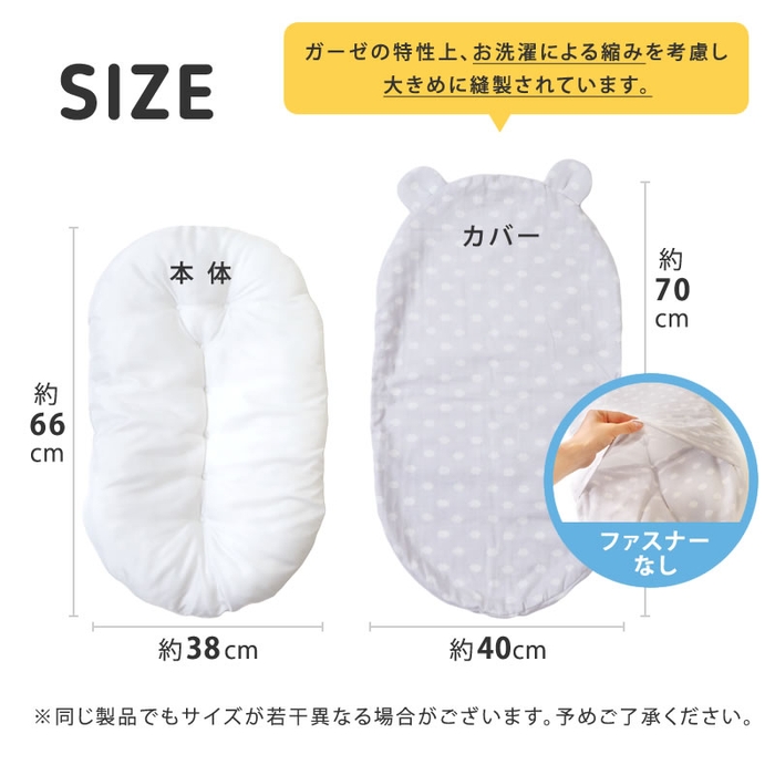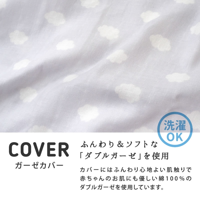 カバーにはふんわり心地よい肌触りで赤ちゃんのお肌にも優しい綿100%のダブルガーゼを使用しています。