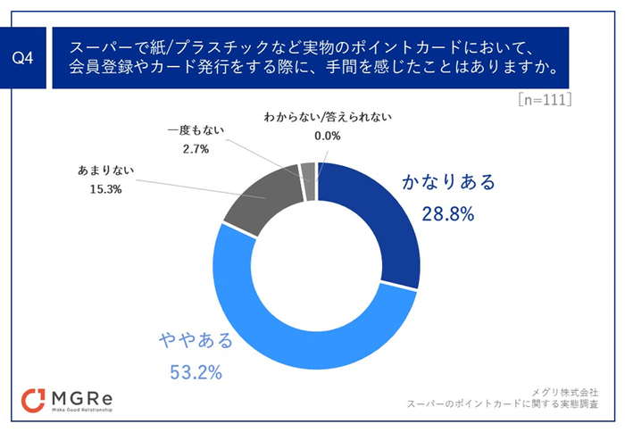 「Q4.スーパーで紙/プラスチックなど実物のポイントカードにおいて、会員登録やカード発行をする際に、手間を感じたことはありますか。」(n=111)と質問したところ、「かなりある」が28.8%、「ややある」が53.2%という回答となりました。