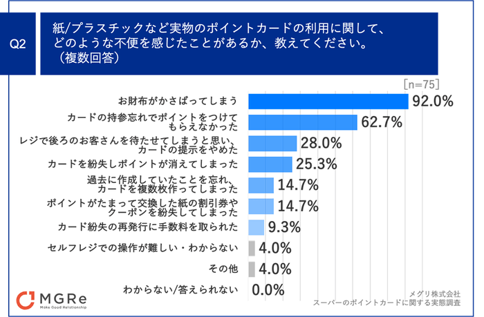 Q1で「かなりある」「ややある」と回答した方に、「Q2.紙/プラスチックなど実物のポイントカードの利用に関して、どのような不便を感じたことがあるか、教えてください。(複数回答)」(n=75)と質問したところ、「お財布がかさばってしまう」が92.0%、「カードの持参忘れでポイントをつけてもらえなかった」が62.7%、「レジで後ろのお客さんを待たせてしまうと思い、カードの提示をやめた」が28.0%という回答となりました。