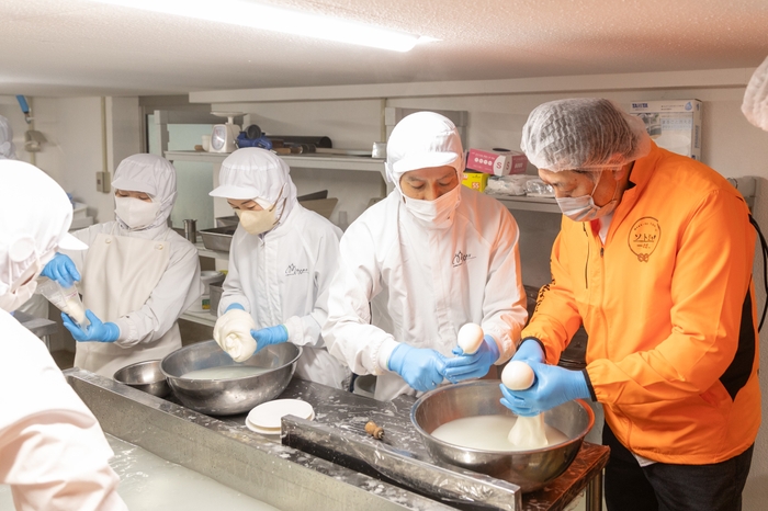 ゆと森倶楽部シェフは2024年4月に工房を訪ね、パスタフィラータ(生地を熱水中で混錬し、繊維状にして成形する)製法のチーズ作りを見学・体験しました。