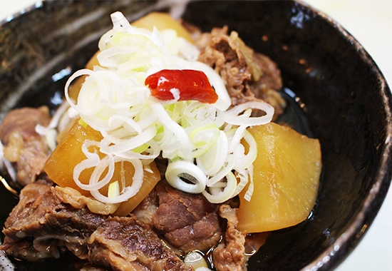 『酒菜 杏』で人気のじっくり煮込まれた牛すじ煮込みは、お肉も野菜もトロトロでお酒がすすむ濃いめの味つけになっています。