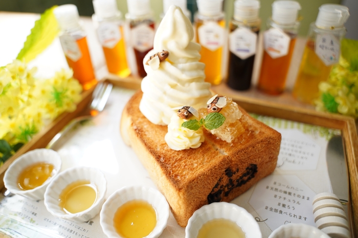 カフェ人気No.1のメニュー。8種類のかけ放題蜂蜜とは別に、さらに5種類のはちみつがついてくる。蜂蜜と相性抜群の食パンは、外はサクッと中はふわふわ。トーストの上には、蜂蜜の甘味を引き立てるミルク感強めのソフトクリームや、ミツバチの巣をイメージしたバター、自然のままの巣蜜(コームハニー)に加え、アーモンドで作ったミツバチも飛んでおり、美味しいだけでなくインスタ映えもバッチリ。