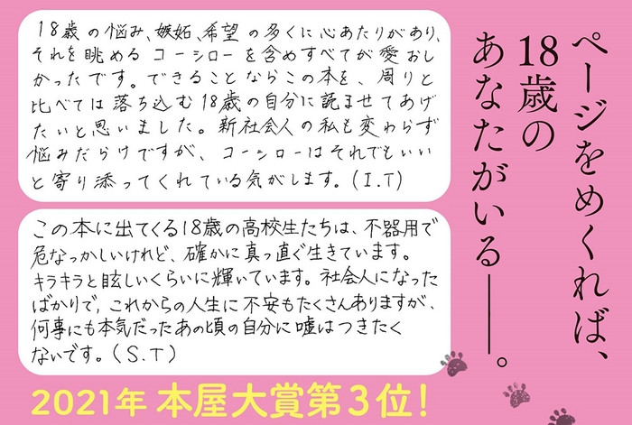 18歳の悩み、嫉妬、希望の多くに心あたりがあり、それを眺めるコーシローを含めすべてが愛おしかったです。できることならこの本を、周りと比べては落ち込む18歳の自分に読ませてあげたいと思いました。新社会人の私も変わらず悩みだらけですが、コーシローはそれでもいいと寄り添ってくれている気がします。(I.T)