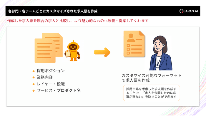 自社のフォーマットにカスタマイズされた求人票を自動作成。既存の求人票も競合の求人票と比較し、改善提案を行います。