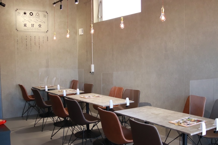 『東甘堂 SAKUMACHI本店』の店内はグレーを基調としたシックで落ち着きのある内装で、ランチ会やデート、おひとり様でのカフェタイムなど、幅広いシーンで活用できるお店になっています。
