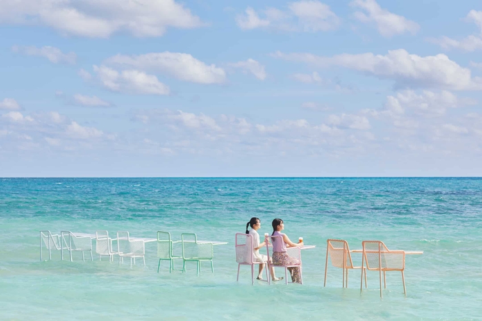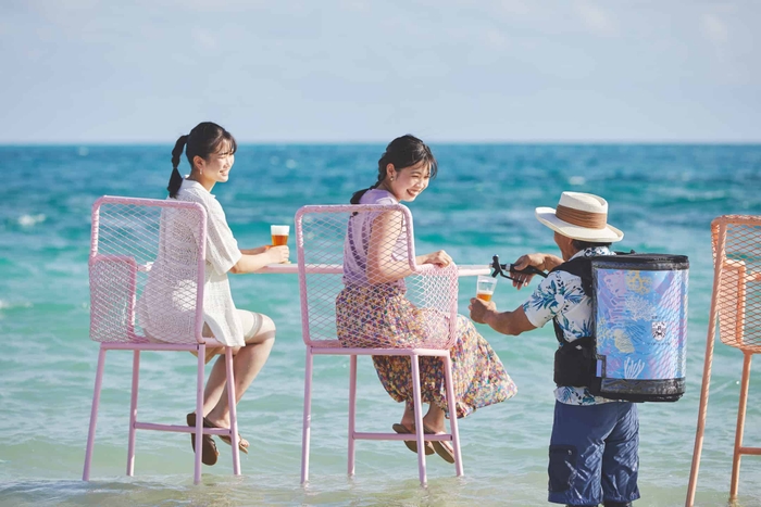 ホテル隣接のビーチから遠浅の海を歩いた先に、色とりどりの海上カウンター席が登場します。 3回目の開催となる今回は、イベント参加者にビールを振る舞う「ハッピーデリバリー」が登場。ビールサーバーを背負った、爽やかな南国らしい装いのスタッフがビーチにいる間、何杯でもビールを楽しむことができます。また今回はサングラスやコースターなど、海上のひと時を楽しむグッズを用意。空と海と自分とが一体に包まれる絶景を、ビールとともに楽しむことができるイベントです。