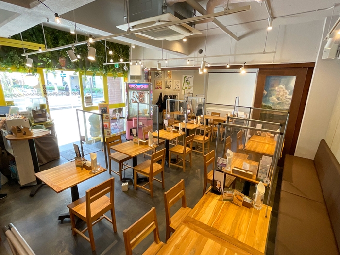 店内は木目調のテーブル席が24席あり、プロジェクターやマイク完備で貸切パーティーでの利用も可能!