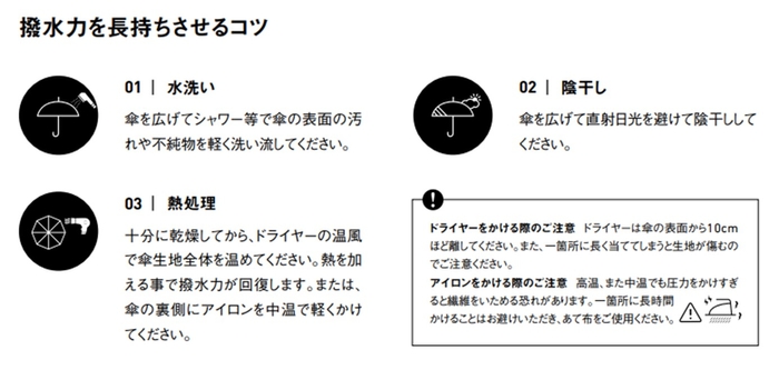 一般的に雨粒や空気中のほこり、傘を巻く際に付着する手脂やハンドクリームなどが生地の表面に残ることではっ水効果は弱まっていきますが、アンヌレラはアフターケアをすることで撥水力が回復。長期間にわたって使い続けられるので、サスティナブルな傘とも言えます。