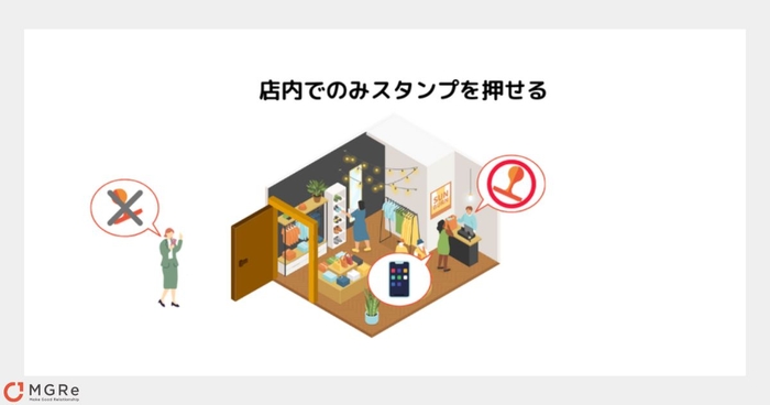 MGReの店内モード(GPS判定機能)*を活用し、お客様が来店中と判定した場合にのみスタンプを自動で付与する「来店スタンプ」としてご活用いただけます。