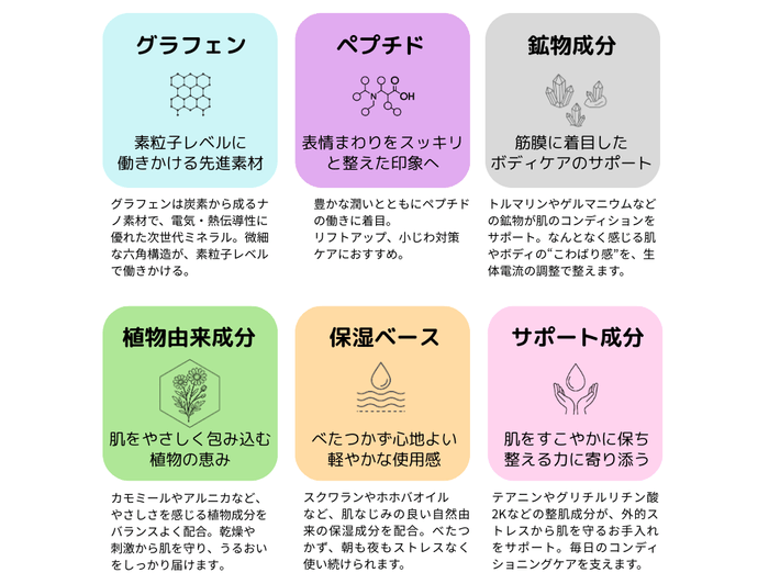 炭素から生まれた先端素材「グラフェン」と、白金・ゲルマニウムなどのミネラルを組み合わせた処方が、肌のコンディションをすこやかに整え、心地よいケア時間をサポートします。