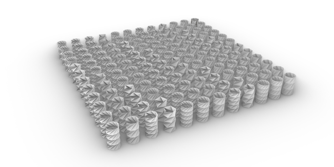 紙を折ったときに生まれる幾何学的パターンを、モノの表面構造(サーフェス)に応用することで、折り畳み性や衝撃吸収性、吸音性など様々な機能を付与することができます。