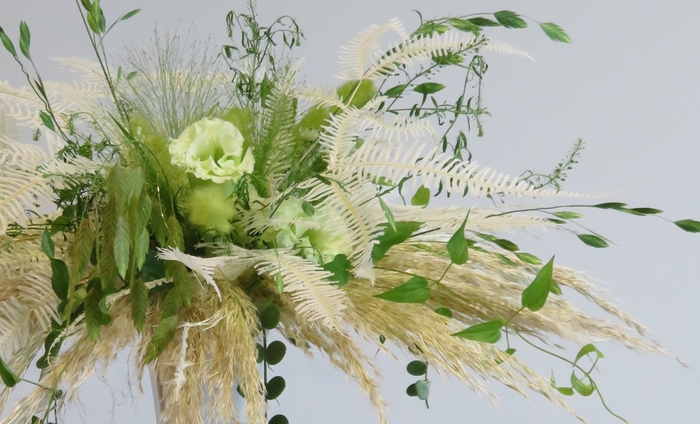 「ハランのオブジェ」はハランの葉で作った土台に、グリーンのお花をあしらった涼やかでモダンなオブジェ。