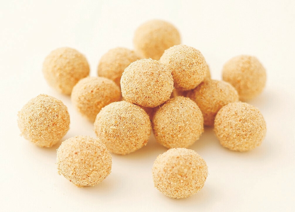 ポリポリする心地よい食感にするため、煎り大豆を特製生地で包み、花かつおと豆乳などをミックスした粉末をコーティングした3層構造になっています。