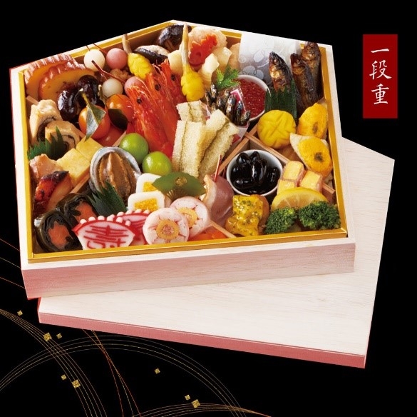 1.はちみつ入り伊達巻き 2.紫花豆 3.金柑 4.紅白てまりきんとん串 5.メープル胡桃 6.陣笠椎茸 7.海老新丈 8.姫くわい松笠 9.壽金時人参 10.穂付筍 11.南高梅白坂巻 12.鱒いくら醤油漬け 13.もみじ漬け 14.鰤鳴門巻 15.赤魚西京焼き 16.さつまいものレモン煮 17.海老の旨煮 18.若桃甘露煮 19.田作り煮 20.味付け子持ち昆布 21.子宝刻み昆布 22.鮑旨煮 23.糸昆布甘酢炊き 24.紅鮭昆布巻き 25.壽かまぼこ 26.数の子小川巻き 27.壽昆布扇子 28.かに風味水車巻 29.源平なます 30.黒豆煮 31.合鴨かんざし 32.若鶏醤油チーズ焼き 33.生ハムマンゴームース 34.キャロットラペ 35.レモンシロップ漬け 36.ブロッコリーのバジルオイル漬け 37.鮎柚子煮 38.黄金くわい 39.鰆菜種焼
