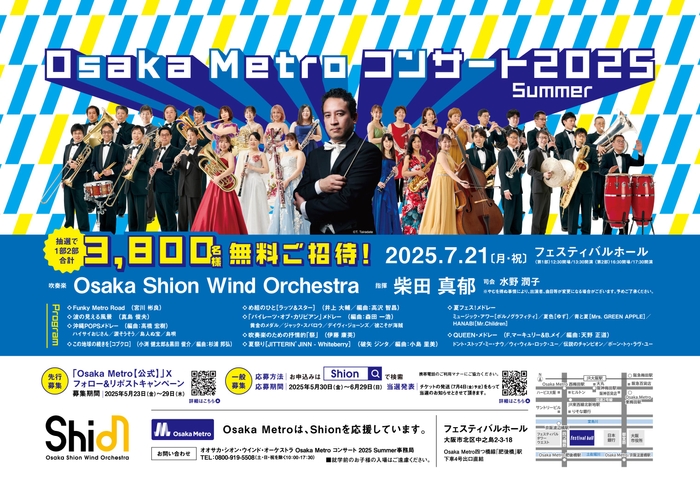 大阪市高速電気軌道株式会社(Osaka Metro)と公益社団法人 大阪市音楽団(Shion)は、2025年7月21日(月曜日・祝日)にフェスティバルホールで開催するオオサカ・シオン・ウインド・オーケストラによる「Osaka Metroコンサート2025 Summer」に、抽選で3,800名様を無料でご招待します。