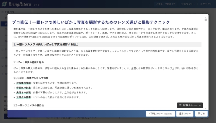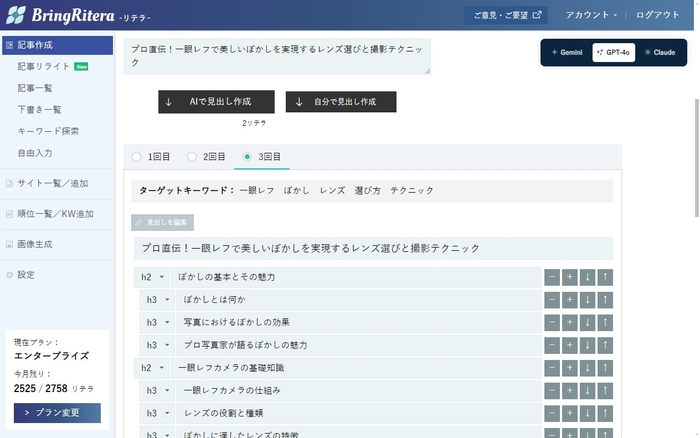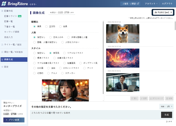 株式会社BringFlower(東京都新宿区、代表取締役:稲田 高洋)が開発・運営するSEOに強い記事をAIで自動生成するAIライティングツール「BringRitera(リテラ)」は、最高峰生成AIモデルの各最高モデルである「GPT-4o」、「Gemini 1.5 Pro」、「Claude 3.5 Sonnet」、「FLUX.1 [pro]」、「Stable Image Ultra」、「DALL-E 3」を搭載し、AIライティング機能と画像生成AI機能を用いることができます。どのモデルを利用するのが適しているかは、記事のジャンルやテーマによりケースバイケースでもあるため、選択肢があることを多くのユーザー様に支持いただいています。