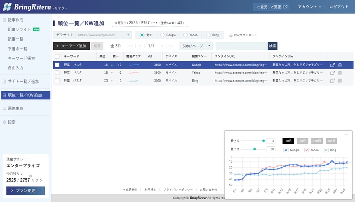 また、毎日自動で検索順位を測定し分かりやすいグラフで提示するため、生成AIベースの記事と検索順位との関係を探ることも可能となっています。