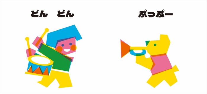 絵本『たいこどんどん』の全ページのパネルのほか、イラストの図形パーツを切り出した紙の原本なども展示します。また、1見開きのイラストパーツの切り出しから着色までの工程をおった貴重な動画も公開します。アナログとデジタルを融合させた、三浦太郎さん独特の制作プロセスをぜひ間近でお楽しみください。