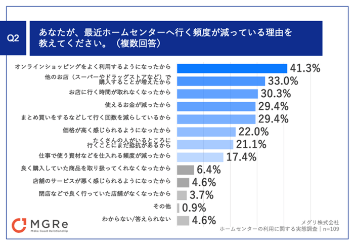 「Q2.あなたが、最近ホームセンターへ行く頻度が減っている理由を教えてください。(複数回答)」(n=109)と質問したところ、「オンラインショッピングをよく利用するようになったから」が41.3%、「他のお店(スーパーやドラッグストアなど)で購入することが増えたから」が33.0%、「お店に行く時間が取れなくなったから」が30.3%という回答となりました。