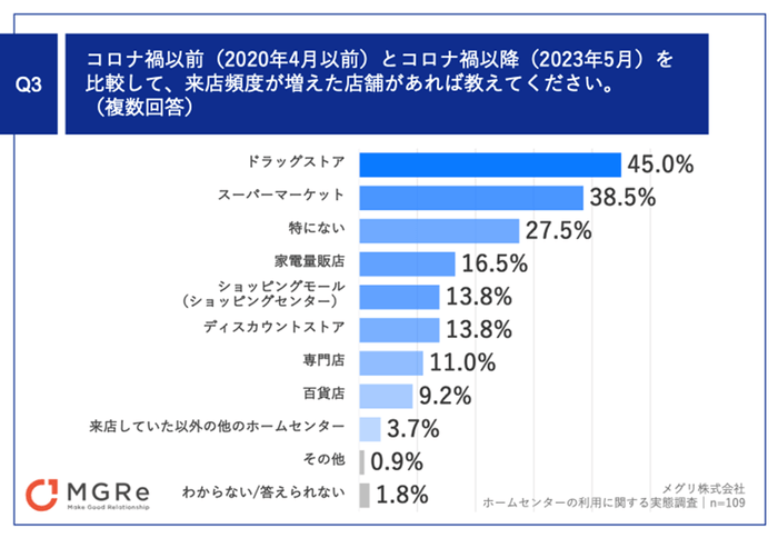 「Q3.コロナ禍以前(2020年4月以前)とコロナ禍以降(2023年5月)を比較して、来店頻度が増えた店舗があれば教えてください。(複数回答)」(n=109)と質問したところ、「ドラッグストア」が45.0%、「スーパーマーケット」が38.5%、「家電量販店」が16.5%という回答となりました。