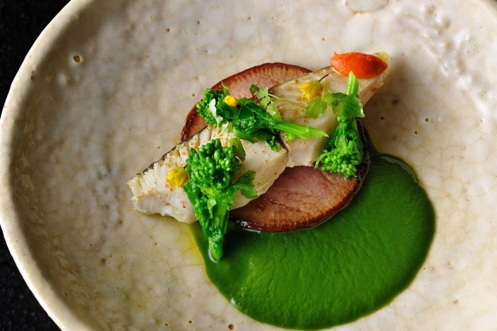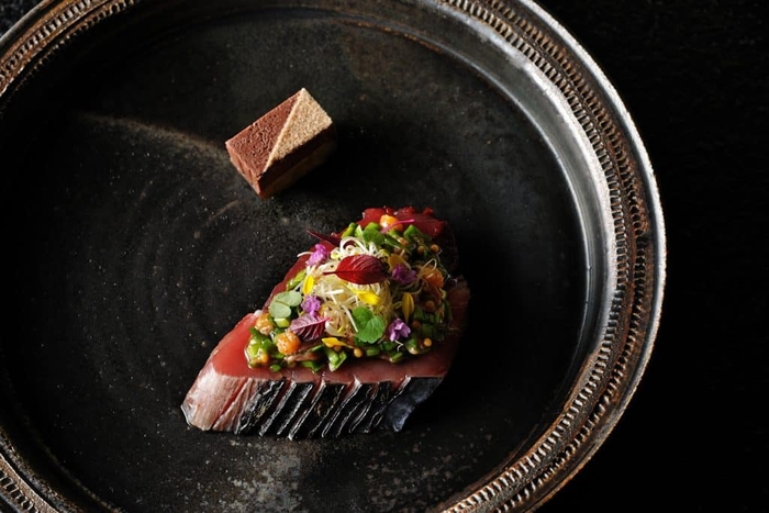 春先から水揚げされ、さっぱりとした赤身が特徴の初鰹を藁焼きにした一皿です。皮目を炙り、ごま油でマリネした初鰹に、香り高く柔らかい春のにらと、発酵食品の酒盗とたまり漬けマスタードをあわせたソースをのせています。さらに、ピンクペッパーとブラッククミンを左右に散らすことで、食べ進めるにつれ、味の変化を楽しめます。また、鮮度が落ちるのが早いため、普段は捨てられてしまう鰹の血合いを使った、鰹のブーダンノワール(フランス料理で、豚肉の血と脂で作られる腸詰めの一種)も添えました。野菜と一緒に火を通した鰹の血合いを、ハーブとあわせ、オーブンで蒸し焼きにしています。