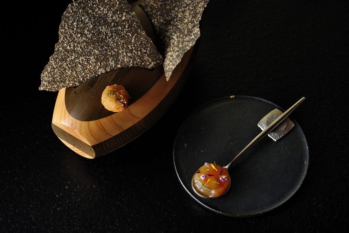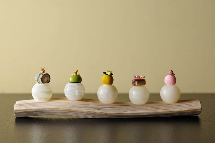 五味(酸・塩・苦・辛・甘)をそれぞれ小さな料理に詰め込み、繊細な技術で表現した星のや東京総料理長 浜田 統之の代表的な料理の一つです。料理の味付けには、塩麹や醤油麹といった日本で古くから親しまれてきた発酵食品を使用しています。塩漬けにした唐辛子を柚子や糀と混ぜて発酵させた「かんずり」といったフレンチでは珍しい発酵食品も取り入れています。
