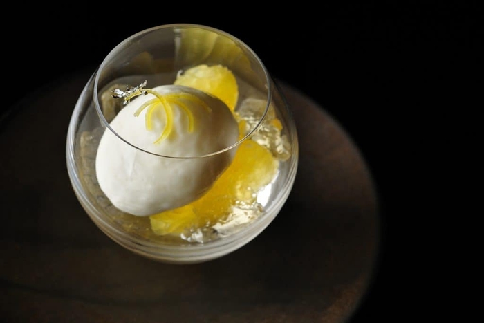 上品な甘さと酸味が特徴の文旦を主役にしたデザートです。フレッシュな果肉や外皮をコンフィにしたものを使用することで、甘味や酸味、苦味といった文旦の様々な味わいを楽しめます。四季春茶ジュレ、ヨーグルトとエルダーフラワーのエスプーマを合わせ、爽やかで華やかに仕上げています。