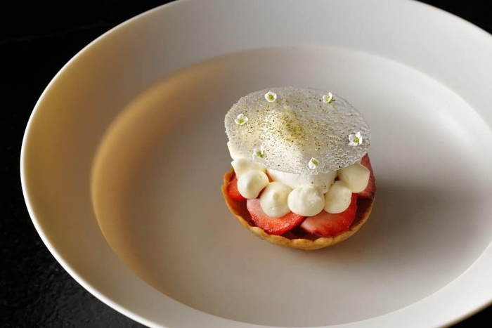 春の香りが楽しめる蕗の薹のアイスクリームとフレッシュな苺の爽やかなデザートです。8年熟成させたシャルトリューズ(薬草とスパイスから作られたリキュール)のクリームを合わせました。薄い飴を割ると、蕗の薹の春らしい香りを感じられます。春らしい苺の甘酸っぱさと、蕗の薹のほのかな苦みとの相性がぴったりな一品です。