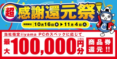 「超 感謝還元祭」を10月16日から11月4日までの期間限定で開催 人気のゲーミングPCや高性能ノートPCなど 対象iiyama PCのご購入で最大10万円分相当を還元